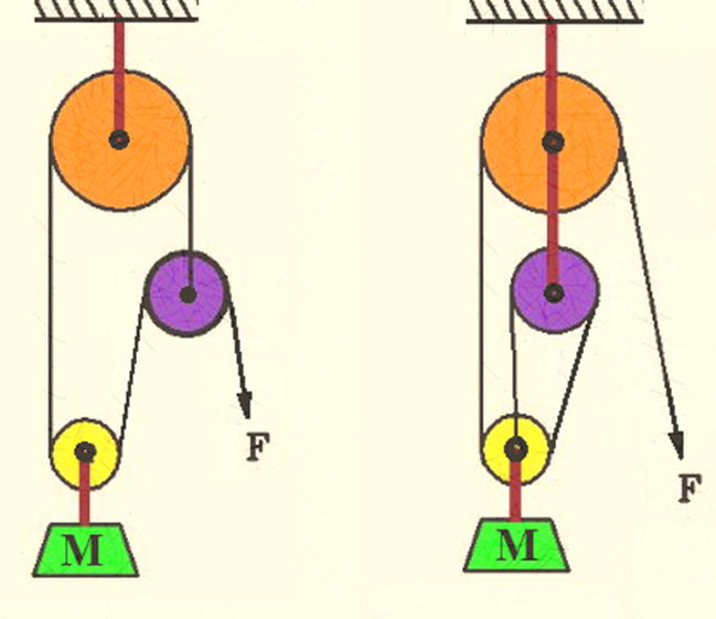 고정 도르래의 질량을 무시할 수 있으므로 양쪽 줄의 장력은 같아야 한다: $T$.