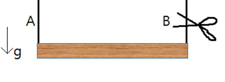 막대의 양끝을 두 줄 $A$, $B$를 이용해서 천정에 평행하게 매달았다. $B$를 자르면 막대는 움직이기 시작할 것이다. 운동을 시작하는 순간 $A$에 걸리는 장력은?