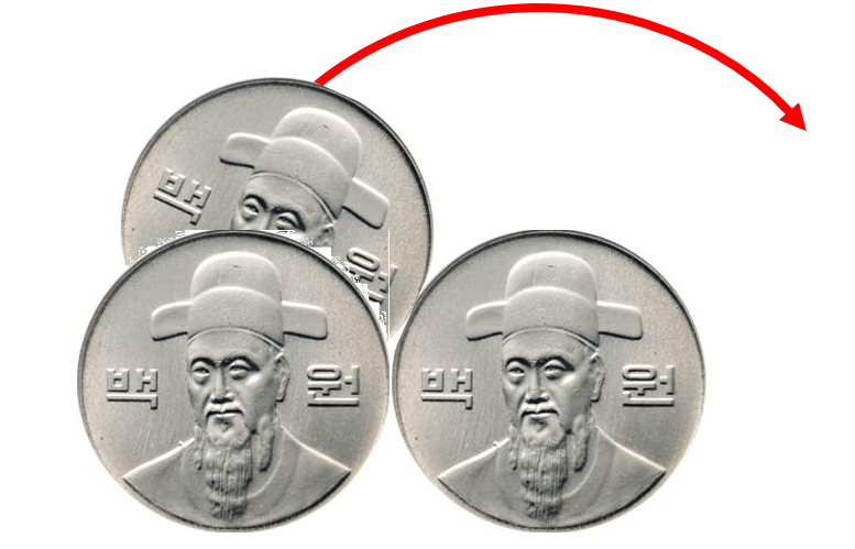 100원짜리 동전을 다른 고정된 100원짜리 동전 둘레를 따라 굴린다. 처음 출발 위치로 돌아왔을 때 얼마의 각을 회전한 것일까?