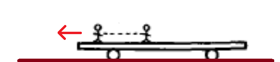 순차적으로 뛰어내리는 경우: 열차에 n명의 사람이 남아 있을 때 속도를 $V_n$이라면($V_N=0$), 한 명이 추가로 뛰어 내려면 열차의 속력은 $V_{n-1}$이고 되고(이때 사람의 속도는 $V_{n-1}-u$(지상 기준)), 이 과정에서 운동량 보존을 적용하면