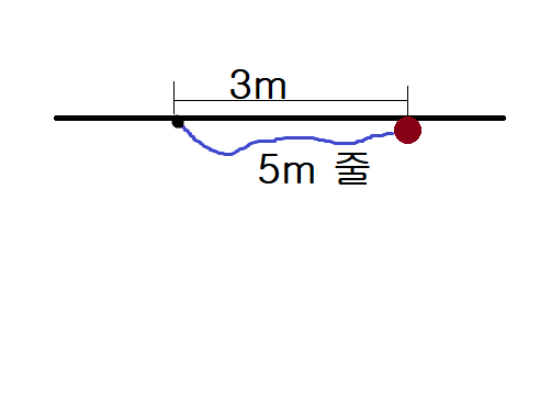 높은 천정에 고정된 5 미터 줄의 반대편 끝에 추를 매달고 그림과 같은 위치에서 낙하시킨다. 줄이 팽팽해지는 직후 추의 속력은(m/s)?