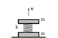 처음 용수철은 원래 길이($L_0$)보다 $ mg /k=d_0$만큼 압축이 된 상태($L = L_0 -d_0$)이다. 바닥의 물체가 뜨기 위해서는 용수철이 원래길이보다 $d_0$만큼 더 늘어나야 한다. 위로 $v$로 움직이는 관찰자가 보면 바닥에서 떨어지기 직전 역학적 에너지는(위쪽 물체를 중력 위치에너지 기준점으로 삼음)