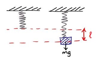 용수철 상수 $k$인 용수철에 질량 $m$인 물체를 매달면 길이가 $\ell$만큼 늘어난 위치까지 내려간다. 이 과정에서