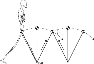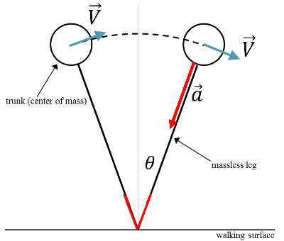사람이 걷는 동작은 복잡하지만 몇 가지 가정을 하면 단순한 강체의 운동으로 근사를 할 수 있다. 우선 사람이 걷는 동안 항상 한 발은 땅을 딛고 있다. 그리고 땅을 딛고 있는 발을 기준으로 몸의 질량중심은 원호를 그리면서 거의 일정한 속도로 움직이게 된다. 사람을 질량중심에 모든 질량이 뭉친 점으로 근사를 하면 걷는 동작은 거의 질량이 없는 막대(다리: 길이=$L$)에 매달린 역진자(inverted pendulum) 운동과 비슷하다고 볼 수 있다. 또한 원호를 따라 중심이 이동하는 속력은 거의 일정하다고 근사할 수 있다.