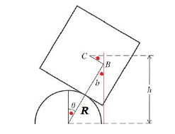 질량중심의 운동에너지와 위치에너지를 구해야 한다. 접촉점이 이동한 거리가 $R\theta$이므로 질량중심의 위치는 (작은 진동만 고려하면 $\theta^2$항까지만 유지하면 된다)