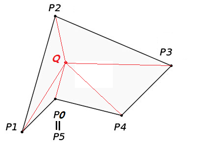 $$\begin{align} \text{다각형 면적} &= \sum \text{각 삼각형의 면적} \\ &= \frac{1}{2}\sum ({\bf P}_{i+1}-{\bf Q})\times ({\bf P}_{i}-{\bf Q})\quad \quad ({\bf Q}\text{는 임의의 점})\\ &= \frac{1}{2} \sum\left( {\bf P}_{i+1} \times {\bf P}_{i} - {\bf P}_{i+1}\times {\bf Q} + {\bf P}_{i} \times {\bf Q}\right) \\ &=\frac{1}{2} \sum {\bf P}_{i+1} \times {\bf P}_{i} \\ &= \frac{1}{2}\sum \left( x_{i+1} y_{i} -x_{i}y_{i+1} \right) \end{align}$$