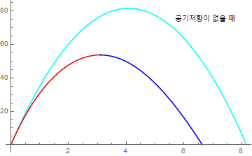로 주어지므로 공기저항이 없을 때보다 더 짧다. 최고점의 높이는
