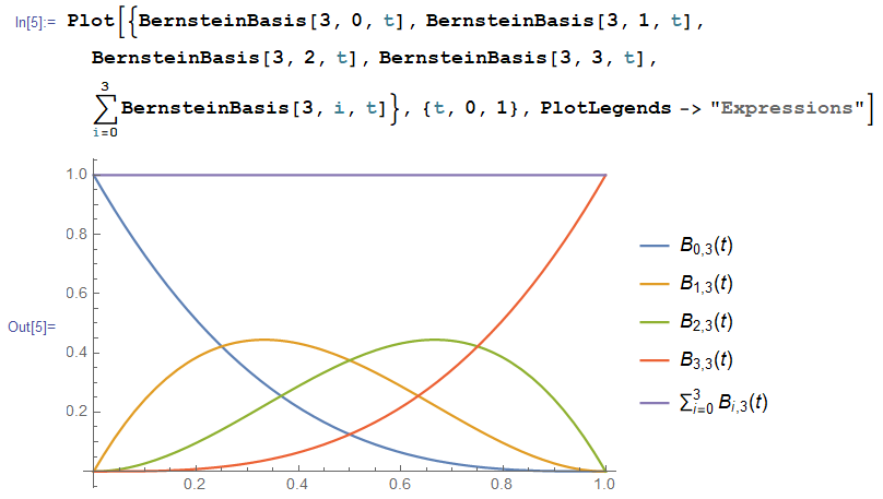 $$\mathbf {B}(t) = \sum_{i=0}^{n} B_{ i, n} (t) \mathbf {P}_i , \quad B_{i,n}(t)=\left(\begin {array}{c} n \\ i \end {array} \right) t^i (1-t)^{n-i}.$$