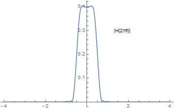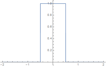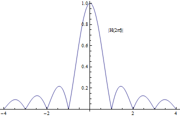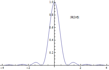$$ K(x) = \left\{ \begin{array}{ll} 1, & |x| < \frac{1}{2} \\ 0, & |x| \ge\frac{1}{2}\end{array} \right. , \quad\quad H(\omega) =\int_{-\infty}^{\infty} K(x) e^{-i\omega x}dx= \text{sinc} \Big( \frac{\omega}{2} \Big) $$