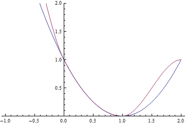 로 표현된다. 다음 예는 $0\le x<1$ 구간에서 $(x-1)^2$(blue)을 cubic interpolation(red)을 한 결과이다.