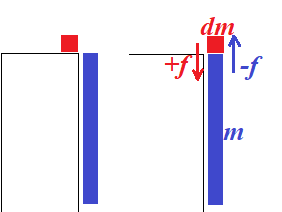 [두번째 풀이]: 새로이 추가되는 $dm$까지를 계로 선택하며($dm$이 책상 위의 나머지 부분에 주는 힘은 없다) 계가 받는 수직 방향 알짜외력은 떨어지는 부분의 무게뿐이다. 따라서 계의 운동방정식은 (계의 질량은 계속 추가되므로 가변이다)