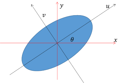 로 주어지므로 회전된 좌표계 $(u, v)$에서 타원의 방정식은