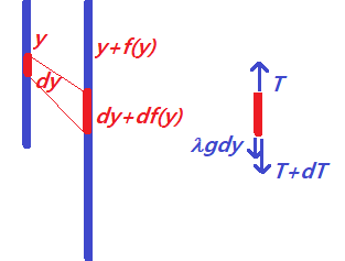 그리고 $T$는 나머지 아래의 무게를 지탱하므로 (또는 미소길이 부분에 뉴턴 법칙을 적용해서 얻은 식 $dT = -\lambda g dy, ~T(0)=\lambda g L$을 적분하던지)