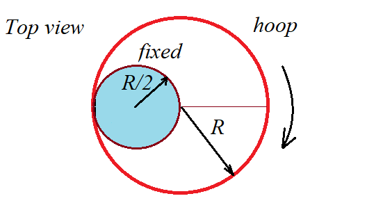 반지름 $R$인 훌라후프가 반지름이 $R/2$인 사람 허리를 축으로 일정하게 돌고 있다. 훌라후프 중심이 돌아가는 각속도가 $\omega$일 때 운동에너지는 어떻게 표현되는가? 후프의 회전관성은 $MR^2$이다.