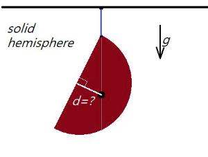 반지름 $R$인 속이 채워진 반구를 그림과 같이 천정에 매달아 놓았다. 반구면의 중심에서 연직선까지 그은 수선의 길이 $d$는 얼마인가? (물리적인 의미는?)