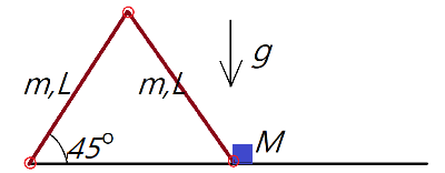 그림처럼 경첩으로 연결된 동일한 두 막대가 있다. 왼쪽 막대는 바닥 경첩에, 오른쪽 막대는 질량 $M$인 물체에 경첩으로 연결되어 있다. 두 막대의 중간 연결 부위가 바닥에 닿는 속도는 $\sqrt{gL}$의 몇 배인가? 마찰은 없다.