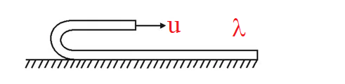 바닥에 놓인 무거운 줄을 일정한 속도 $u$로 그림처럼 당긴다. 얼마의 힘이 필요할까? 줄은 바닥에서 미끄러지지 않고 부드럽게 접힌다고 생각할 수 있고, 줄의 선밀도는 $\lambda$다.