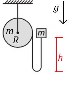 질량 $m$인 물체가 원판(질량 $m$, 반지름 $R$)의 둘레에 감겨있는 실과 연결되어 있다. 처음 원판은 정지상태이고, 물체도 정지상태에서 낙하를 시작한다. 줄이 팽팽해진 직후 물체의 속력은? 어떤 물리법칙이 적용되는가?