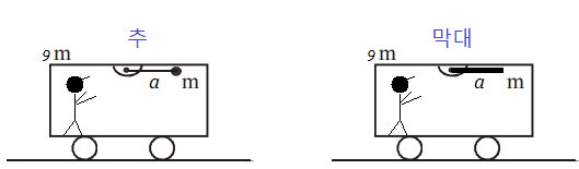 추/막대가 수직이 될 때 사람이 보는 속력이 더 큰 쪽은(막대는 끝 지점)? 차는 처음 정지상태였고, 사람과 차의 총질량은 $9m$이다.