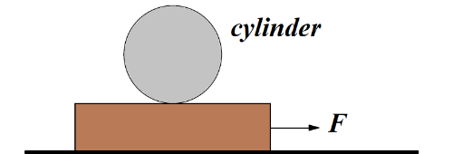 정지한 판 위에 실린더가 놓여있다. 판과 실린더 사이의 마찰은 충분해서 실린더는 판 위에서 미끄러지지 않는다. 판을 그림처럼 오른쪽으로 당기면 실린더는 어떻게 운동할까?