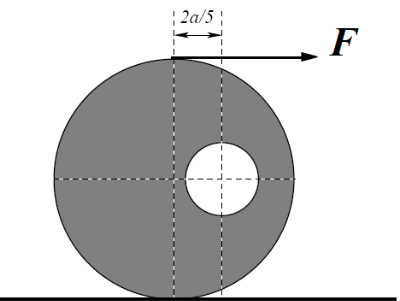 반지름 a, 무게가 100 N인 균일한 실린더가 있다. 이 실린더의 축방향과 나란한 구멍을 그림처럼 만들었더니 80 N의 무게를 가지게 되었다. 구멍이 난 실린더를 그림과 같이 놓은 후 움직이지 않게 하려면 얼마의 (수평 방향) 힘을 주어야 할까?