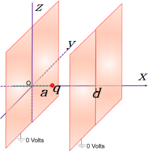 이 문제는 도체와 점전하이므로 영상 전하법(method of image)을 이용해서 풀 수도 있지만, Green's reciprocity theorem를 사용하는 것이 더 간단하다. 이를 위해 좀 더 전하분포가 단순한 구성을 만들자. 접지를 없애고 한 극판 ($x=0$)에는 균일하게 양전하를, 반대 극판($x=d$)에는 동일한 양의 음전하로 균일하게 대전시키면(구성 1) 사이에서 전위는 $$V_1(x)= V_0 \left( 1- \frac{x}{d}\right) $$로 쉽게 구할 수 있다. 점전하를 넣은 경우(구성 2)는 구성 1의 전하가 있는 극판에서 전위를 안다. 따라서 reciprocity theorem을 쓰면 구성 2일 때 극판에 모이는 전하가 얼마인가를 알 수 있다. 구성 1의 $\rho_1$은 극판에서만 0이 아니고, 구성 2의 $V_2$는 접지때문에 극판에서 $V_2(x=0)=V_2(x=d)=0$이므로