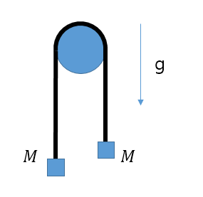 도르래에 길이 $L$인 고무줄이 걸쳐 있고 양 끝에는 질량 $M$인 물체가 매달려 있다. 고무줄은 용수철 상수가 $k$인 이상적인 용수철로 생각할 수 있다. 물체가 평형에 이르렀을 때 고무줄의 총길이는?