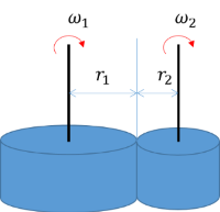 반지름이 각각 $r_1$, $r_2$인 두 원판이 중심을 지나는 축에 대해 $\omega_1$, $\omega_2$ 각속도로 자유롭게 회전을 하고 있다. 회전축을 서로 가까이 해서 두 원판의 가장자리를 접촉시키자 일정한 시간이 지난 후 두 원판은 동시에 정지했다. 두 원판은 동일한 재질과 두께를 가진다. 접촉하기 전 두 원판이 같은 값을 갖는 물리량은?