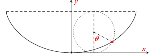 이어서 $(x(\theta), y(\theta))$는 cycloid가 됨을 알 수 있다. 이 cycloid는 반지름 $gT_0^2/\pi^2$인 원을 일정한 높이의 수평선 $y=2gT_0^2/\pi^2$에 접하게 굴릴 때 원점에서 바닥과 접촉했던 점이 그리는 곡선이고, $\theta$는 원의 중심과 이 점을 잇는 선분이 수직과 이루는 각을 나타낸다.
