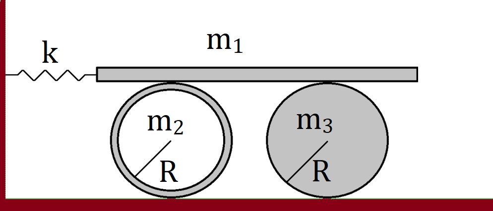 막대를 살짝 당겼다가 놓으면 앞뒤로 일정하게 진동을 하게 되는데 그 주기는 어떻게 되는가? 막대 아래의 두 실린더(hollow and solid)는 미끄러짐이 없이 구른다.