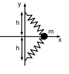 두 개의 동일한 용수철(늘어나지 않은 길이=$h$)에 연결된 물체를 $x$방향으로 1cm 만큼 당긴 후 놓았더니 주기가 1초인 진동을 한다. 만약 당긴 거리를 2cm로 하면 진동의 주기는 어떻게 될까? 단, $h \gg 2\text{cm}$이다.