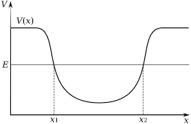 그림과 같은 퍼텐셜 우물에 갇힌 질량 $m$인 입자가 $x_1$에서 운동을 시작해서 다시 처음 위치로 돌아오는 데 걸리는 시간이 $T$다. 질량이 $2m$인 입자가 같은 위치에서 운동을 시작한다면 다시 처음 위치로 돌아오는 데 걸리는 시간은 $T$의 몇 배나 될까?