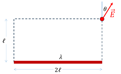 균일하게 대전된 막대 전하가 있다. 그림에 표시된 위치에서 전기장의 방향($\theta$)는?
