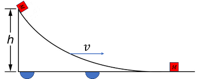 일정한 속도 $v$로 움직이는 경사면 꼭대기에서 물체가 미끄러지기 시작한다. 물체가 바닥에 내려왔을 때 운동에너지는 얼마나 증가할까?