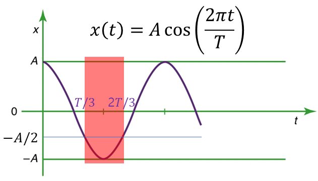 벽과의 탄성충돌이 있을 때 물체의 운동은 벽이 없을 때의 주기운동에서 $T/3 \le t \le 2T/3$ 구간(아래 그림의 붉은색 구간)이 없는 경우와 같다.