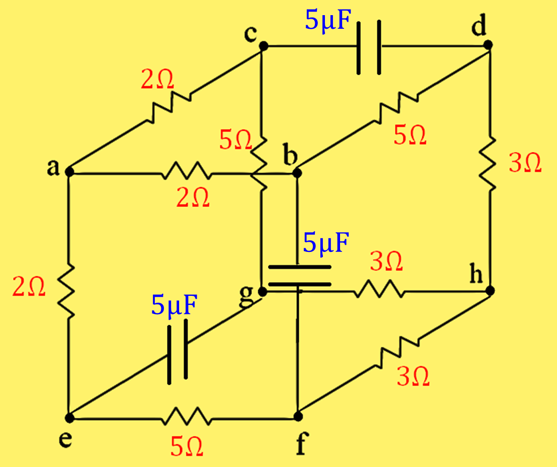 이전 문제(https://kipl.tistory.com/528)와 마찬가지로 b,c,e는 등전위이고, d,g,f도 등전위이다. 충전이 완료된 경우 축전기로 흐르는 전류가 없음을 고려하면 전체 등가저항은 10/3옴이다. 따라서 배터리에서 나오는 전류는 $\frac{6~\text{V}}{10/3~\Omega}=1.8A$이고, 축전기에 걸리는 전위차는 $5\Omega$에 걸리는 전위차와 같으므로 $5\Omega \times \frac{1.8~\text{A}}{3}=3~\text{V}$이다. 축전기에 저장된 전하는 $\rm (5~\mu F) \times (3~V)=15~\mu F$
