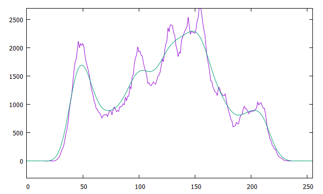 히스토그램은 영상에서 각 그레이 값에 해당하는 픽셀의 수를 주는 일종의 이산적 함수로 생각할 수 있다. histogram에서 피크의 위치는 histogram을 연속적인 함수로 모델링하거나 또는 여러 개의 그룹으로 분리를 할 때 중요한 정보를 제공한다. 영상으로부터 얻은 histogram은 대부분 이웃하는 그레이 값 사이에서 smooth 하게 변하지 않기 때문에 피크를 찾는 작업을 하기 전에 미리 mean filter나 gaussian filter와 같은 smoothing 과정을 거친 후 사용한다. 여기서는 low-pass filter 대신에 histogram의 bin 인덱스와 bin 값을 컨트롤 포인트로 사용해서 만든 Bezier 곡선을 이용해서 histogram을 smooth 한 곡선으로 근사하는 방법을 알아본다. 이 경우 Bezier 곡선은 255-차수의 곡선이 된다. 높은 차원의 Bezier 곡선 계산에 Berstein 함수를 사용하는 경우 truncation 등의 수치 에러 때문에 값이 불안정해지므로 De Casteljau's algorithm을 이용하여서 iterative 하게 값을 계산을 하면 된다.