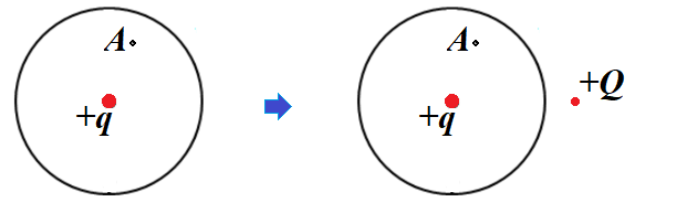 중심에 $+q$ 점전하가 고정되어 있는 도체 구각이 있다. 이 구각 주변에 $+Q$의 점전하를 가져다 놓는 경우 내부의 한 지점 $A$에서