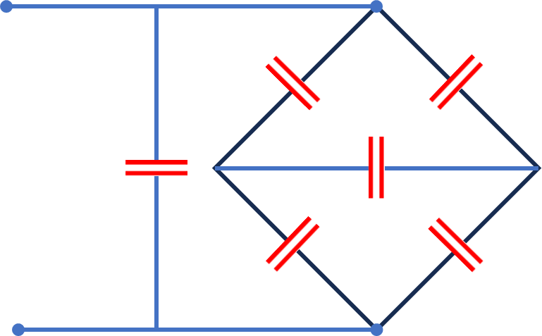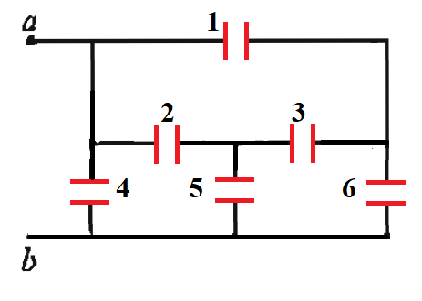 전기용량이 같은 축전기 6개를 이용해서 그림처럼 회로를 만들었다. a-b에 배터리를 연결할 때 전하가 충전되지 않는 축전기는?