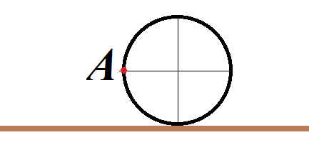 일정한 속도로 굴러가는 원통이 있다. A지점의 가속도와 속도 벡터가 이루는 각은