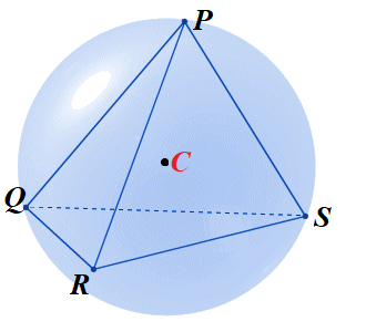 그러면 3차원 사면체 내부에 외접구면의 중심이 포함될 확률은 어떻게 될까? 우선 4점 $P,Q,R,S$가 정해지면 회전시켜도 동일하므로 한 점 $P$를 북극으로 고정하자. 이 경우 $P$에서 중심 $C$를 잇는 대각선이 우선 나머지 삼각형 $QRS$을 통과해야 사면체가 $C$을 포함할 수 있다. 선분 $PC$가 삼각형 $QRS$ 내부를 통과할 확률은 $P$에서 삼각형의 각 꼭짓점을 연결하는 자오선이 적도면에 만드는 삼각형 내부에 이 삼각형의 외접원 중심인 구면 중심이 포함될 확률과 같다. 앞서 외접원 결과를 사용하면 삼각형 $QRS$가 선분 $PC$와 만날 확률은 $\frac{1}{4}$이다. 이 삼각형의 면에서 $P$에 가까운 쪽에 중심이 놓일 때 사면체가 구면의 중심을 포함하는데 그 확률이 $\frac{1}{2}$이므로 전체 사면체 내부에 외접구면 중심이 들어갈 확률은 $\frac{1}{4}\times \frac{1}{2}=\frac{1}{8}$이다.