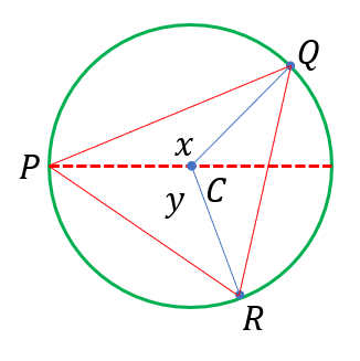 단위원 위에서 선택된 세 점($P, Q, R$)으로 만든 삼각형을 원의 중심에 대해서 임의의 각도로 회전할 수 있는 자유도가 있으므로 먼저 한 점 $P$를 고정시켜야 한다. 나머지 두 점 $Q$와 $R$은 독립적으로 $P$와 단위원 중심($C$)을 통과하는 대각선의 어느 서로 반대편에 놓여야 하고, 또 $Q$와 $R$을 서로 교환할 수 있으므로 이 배치 확률은 $\frac{1}{2} \times \frac{1}{2} \times 2=\frac{1}{2}$이다. $Q,R$이 대각선의 반대편에 놓이더라도 여전히 반원의 임의 지점으로 움직일 자유도가 있다. $x=\angle PCQ$, $y=\angle PCR$이라면 삼각형 $PQR$이 중심을 포함하기 위해서는 두 각의 합이 $x+y \ge \pi$이어야 함을 쉽게 알 수 있다. 그런데 $ 0\le x, y\le \pi$이므로 $x+y \ge \pi$인 영역의 면적은 두 각이 취할 수 있는 영역의 절반이다.(좀 더 단순하게는 선분 $PQ$가 중심 오른쪽에 있으면 되므로 확률이 $\frac{1}{2}$) 따라서 삼각형 내부에 중심이 포함될 확률은 $\frac{1}{2}\times \frac{1}{2}=\frac{1}{4}$임을 알 수 있다.