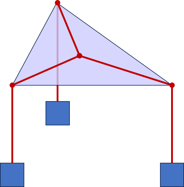 삼각형의 세 꼭짓점에서 거리의 합이 최소인 점을 Fermat point라 한다. 이를 물리적인 방법을 동원해서 찾아보자. 같은 무게의 추가 매달린 세 개의 줄을 묶은 후 수평으로 놓인 삼각형의 꼭짓점에서 설치된 도르래에 걸친다. 추에 걸린 중력 때문에 세 줄이 묶인 매듭은 어느 정도 움직이다 결국에서는 평형상태(정지)가 될 것이다(정지하기 위해서는 공기 저항 등에 의해서 에너지 일부를 잃어버리는 과정이 있을 것이다). 이 평형상태는 에너지가 가장 낮은 상태로 움직임이 없는 경우에는 중력의 위치에너지가 최소가 되어야 한다. 그리고 중력 위치에너지가 최소가 되려면 도르래 아래로 늘어진 줄의 길이가 최대가 되어야 한다. 추를 묶은 줄의 길이가 일정하므로 매듭에서 꼭짓점까지의 거리의 합은 이때 최소가 될 것이다. 그리고 추의 무게가 모두 같으므로 줄에 걸린 장력도 같은 하는데, 힘의 평형상태가 되려면 매듭과 줄이 만드는 세 개의 각은 모두 120도가 되어야 한다(Lami 정리=사인 정리). 물론 삼각의 한 내각이 120도를 넘는 경우에는 힘의 평형에 도달하지 못하므로 매듭은 그 꼭짓점으로 향하게 된다. 즉, 이 경우 Fermat point는 내각이 120도를 넘는 꼭짓점이 된다.