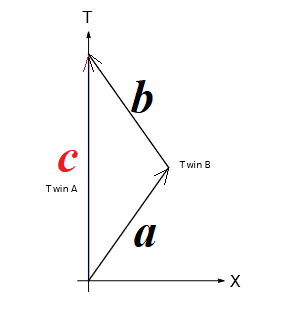 여행을 시작해서 끝날 때까지 지구에 남아 있는 쌍둥이 A가 먹은 나이는 $|\mathbf{c}|$, 여행을 한 쌍둥이 B의 나이는 $|\mathbf{a}| + |\mathbf{b}|$ (목적지에서 방향을 바꾸는과정이 필요하므로 이보다 약간 더 먹는다). 두 쌍둥이가 다시 만났을 때 지구에 남아 있는 쌍둥이가 더 나이가 들어 있으므로