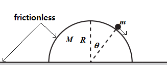 풀이: 물체가 받는 힘은 중력과 반구가 작용하는 수직항력이고, 반구는 수평방향의 운동만 하고 수평힘은 수직항력 반작용의 수평성분이다. 수직항력과 중력의 표면수직성분이 물체의 원운동을 일으키는 구심력 역할을 하는데, 구심가속도가 속력의 제곱에 비례하므로 물체의 속력이 클수록 더 작은 각에서 떨어질 것으로 예상할 수 있다. 그런데 반구가 움직이면 처음 물체가 가지고 있던 중력위치에너지의 일부가 반구에도 할당이 되므로 물체의 속력이 상대적으로 더디게 늘어나므로 표면에서 떨어지는 각위치가 커질것으로 예상할 수 있다. 이 문제는 뉴턴 방정식을 풀어서 해결할 수도 있지만, 외력이 중력뿐이고 마찰력이 없으므로 운동량 보존과 에너지 보존을 이용하는 편이 더 쉽다.