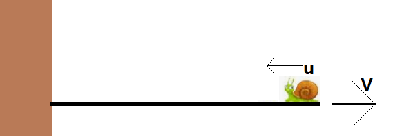 길이 $L$인 고무줄의 한쪽이 벽에 고정되어 있다. 반대편 끝을 당겨서 일정한 속도 $V$로 움직이기 만든다. 끝을 당기는 시점에 고무줄의 끝에 있던 벌레가 벽을 향해서 기어간다. 벌레는 고무줄에 대해서 $u$의 일정한 속력으로 움직인다. 고무줄이 모두 지점에서 균일하게 늘어나는 경우 벌레가 벽에 도달하는 데 걸리는 시간은?