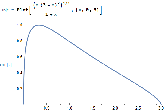 $$I = \int_{0}^{3} \frac{ \sqrt[3]{ x (3-x)^2 }dx }{1+x} = \frac{\pi}{\sqrt{3}} \left( 6- 4\times 2 ^{1/3} \right) \approx 0.554439 \times \pi $$
