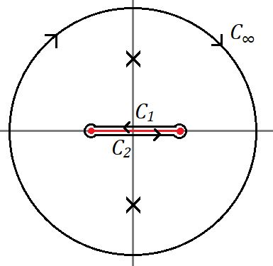 $$ f(z) = \frac{(1-z)^{-\alpha}(1+z)^{-1+\alpha}}{5+z^2}$$ 위상은 $$ 0 \le \arg(1-z) \le 2\pi, \quad -\pi \le \arg(1+z) \le \pi$$로 선택할 수 있다. 그리고 $z_\pm=\pm i \sqrt{5}$는 $f(z)$의 simple pole이다.
