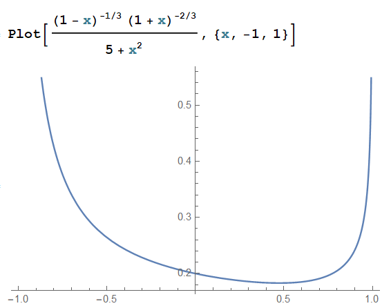$$ I = \int_{-1}^{1} \frac{(1-x)^{-\alpha}(1+x)^{-1+\alpha} dx} {5+x^2}=\frac{\pi }{\sqrt{30}} \frac{ \sin [ \pi \alpha + (1-2\alpha ) \tan^{-1}(\sqrt{5})]}{\sin (\pi \alpha) } \qquad (0< \alpha <1) $$