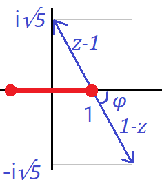 $$\arg(z_- - 1) = \pi +\varphi ~\to ~\arg(1-z_-) =\varphi \\ ~\arg(1+z_-) =-\varphi \\ \to~~ -\alpha \arg(1-z_-)-(1-\alpha)\arg(1+z_-) = (1-2\alpha)\varphi$$이어서 $$\text{Res}f(-i\sqrt{5}) = \frac{(\sqrt{6})^{-1} e^{i (1-2\alpha )\varphi} }{-i 2\sqrt{5}}=\frac{1}{-i2 \sqrt{30}} e^{i(1-2\alpha)\varphi}$$